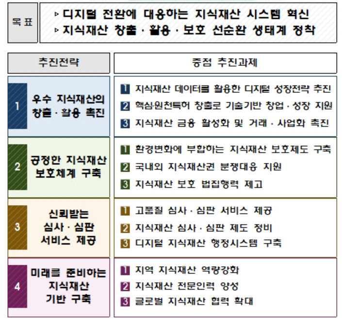 먼저 우수 지식재산의 창출·활용을 촉진한다. AR 등 주력·신산업 분야에 대한 특허 빅데이터 분석을 통해 유망 기술을 발굴해 국가의 연구개발(R&D) 방향 수립을 지원하고 6G 등 국제표준 선점이 중요한 분야에서 표준특허 창출이 유망한 기술을 도출하기 위한 '표준특허 전략맵'을 구축한다.